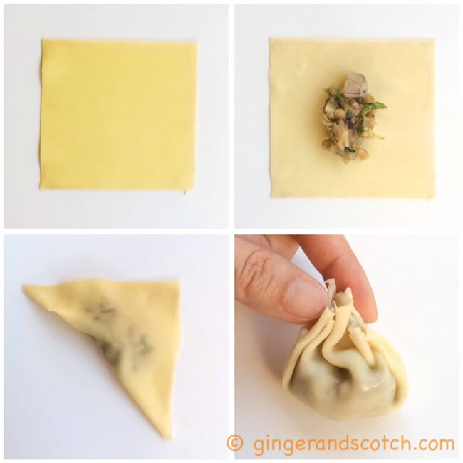 About How to Fold the Wonton: Put some water into a small bowl and use the water to wet the edges of the wonton wrapper with your fingers. Put a teaspoon (or more as long as you don’t burst the wrapper) of the meat and shrimp mixture into the middle of the wrapper. Fold the wrapper over diagonally, pressing down on the edges to seal. Then pinch the two far corners together towards the middle.