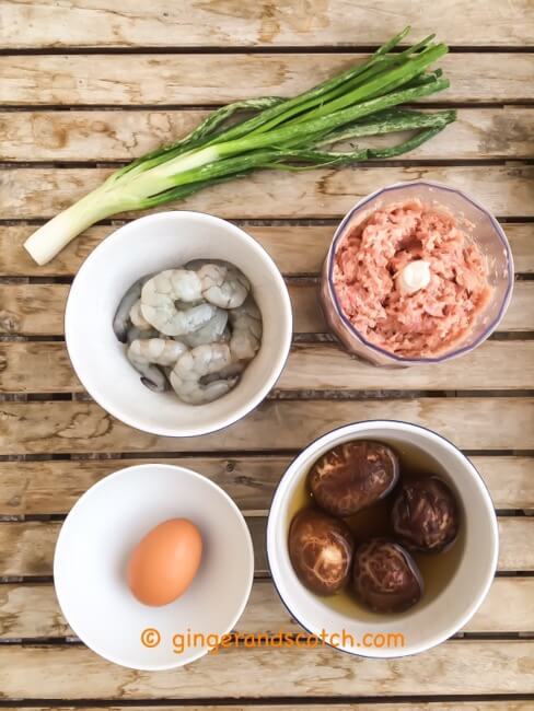 There are 4 main ingredients for these homemade wontons: (1) Shrimp; (2) Chicken or Pork; (3) Chinese mushrooms; (4) Scallions aka green onions.