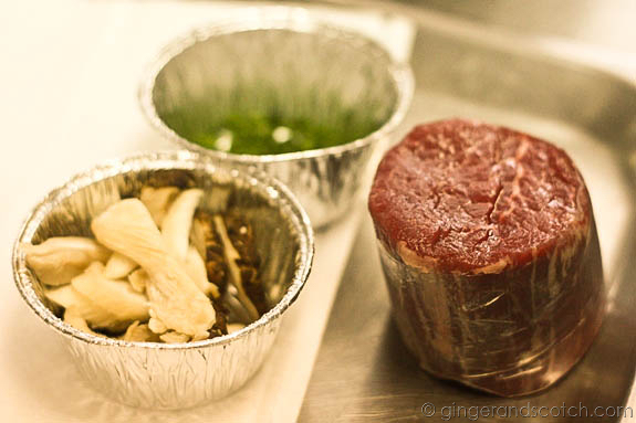 Our mise on place for this entrée: Australian beef fillet (double-wrapped in cling film to keep its shape), wild mushrooms (shitake and oyster which Scott said were, “as wild as you can get here in Dubai”), baby spinach, and chives.