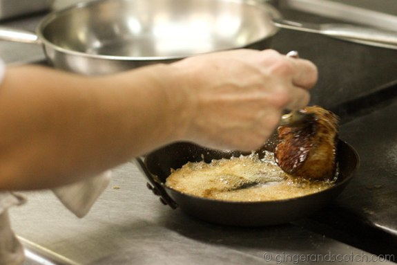 Scott demo’d the making of a sage noisette which is basically a sage butter. He heated up LOTS AND LOTS OF BUTTER until it began to separate into the solid and liquid components. He then swirled the pan around and around and we could clearly see the clarified butter floating at the top. Freshly chopped sage was tossed in, the pan was then removed from the heat and set aside.