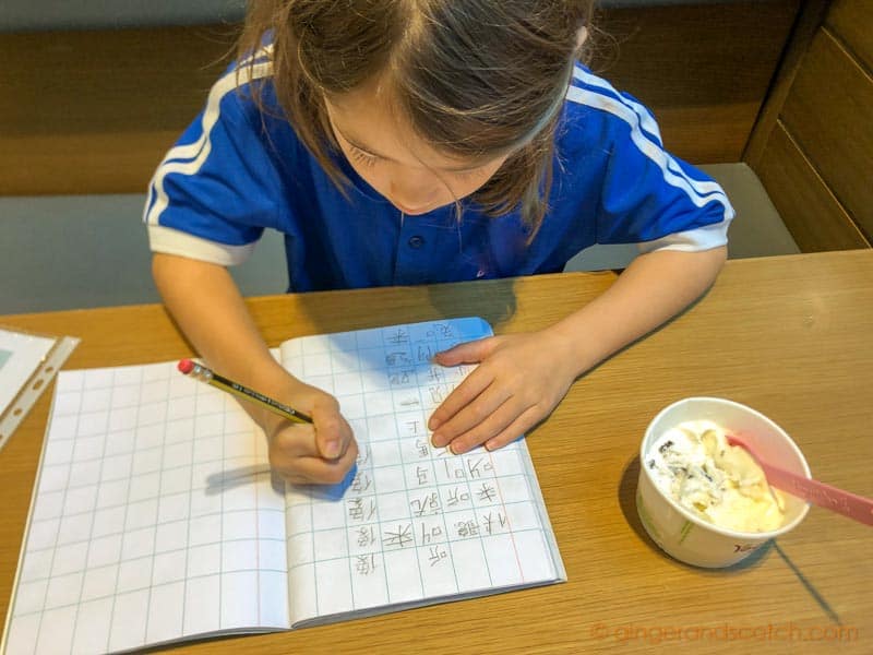So every Monday and Wednesday, my daughter and I grab a table at the frozen yogurt shop and I spend an hour teaching her to read and write Chinese. I read her the 5 chapters and she writes down the sentences – sometimes neatly, sometimes not. I’m working on improving her handwriting but that might require more frozen yogurt bribes.